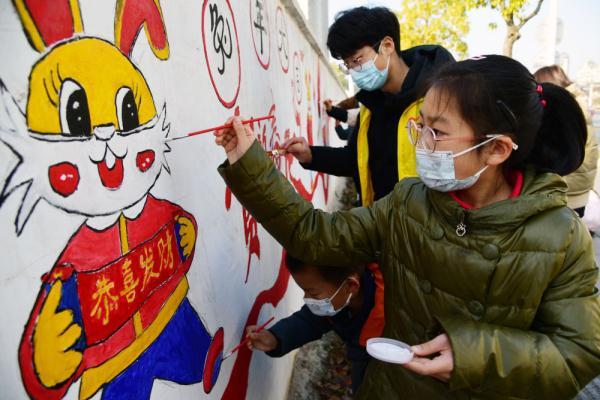 ↑ 1月11日,在江苏省镇江市远洋社区,江苏大学志愿者和小朋友一起描绘“年俗文化”主题墙画。新华社发(石玉成摄)