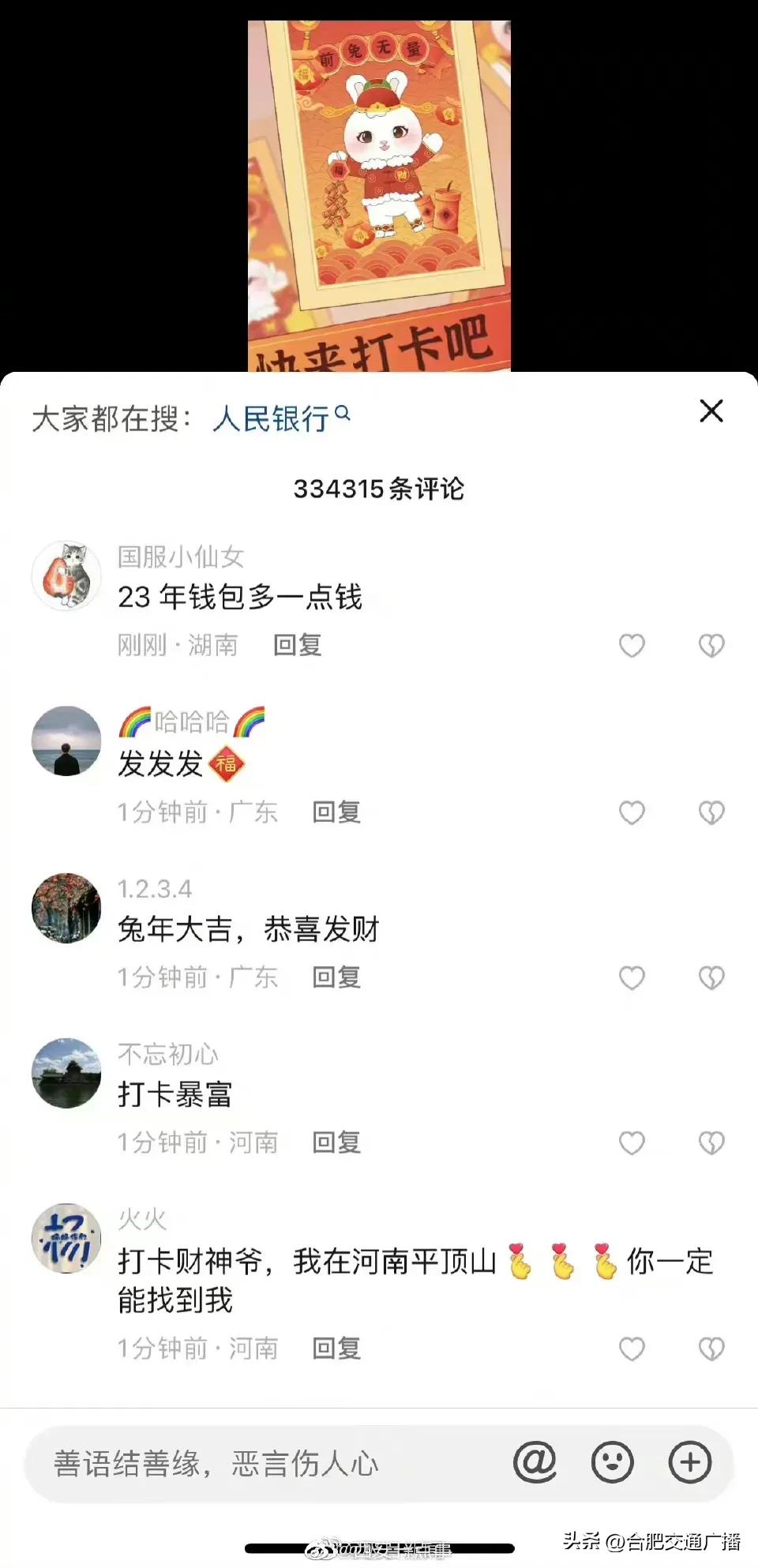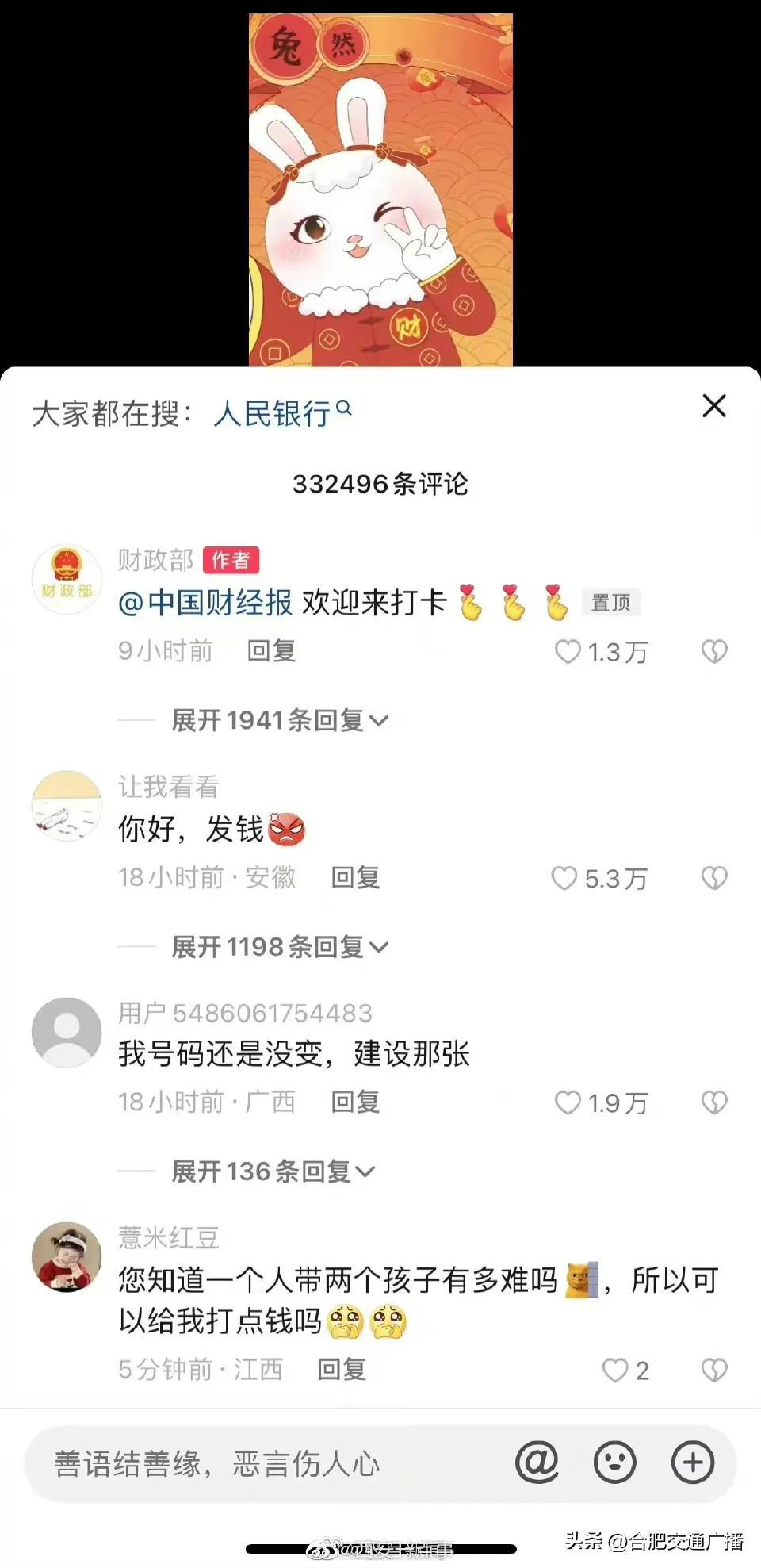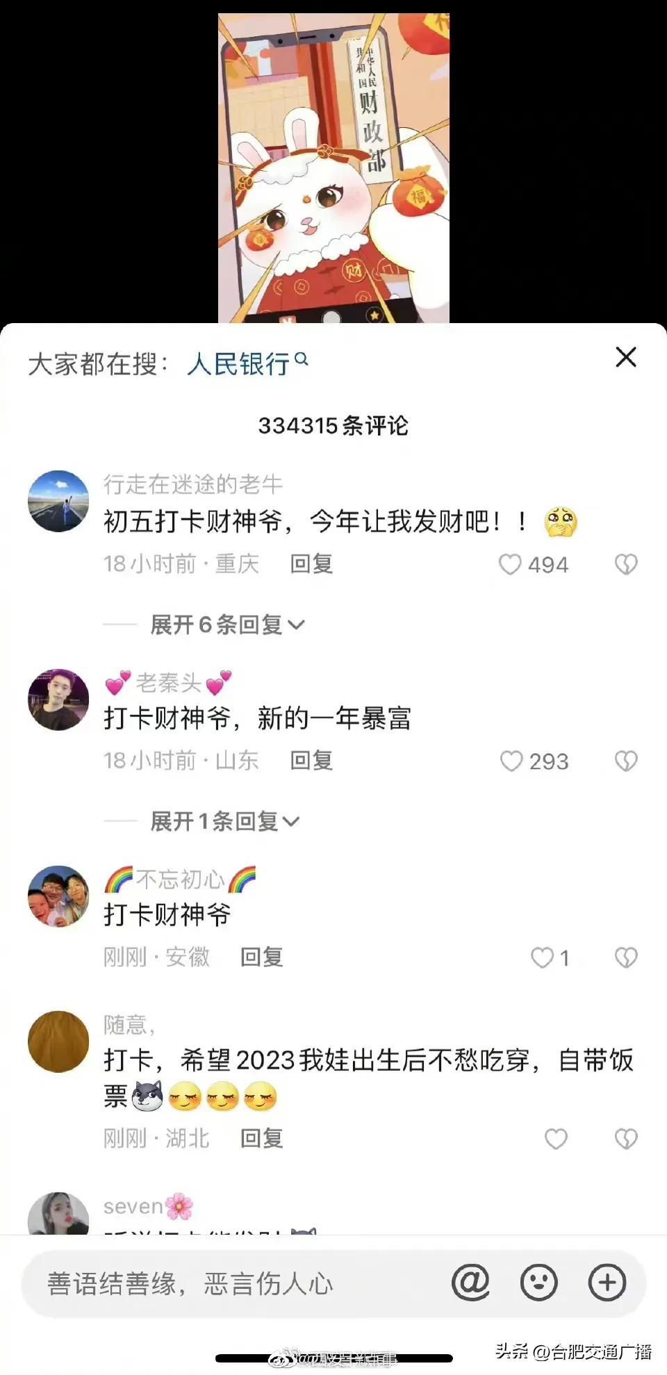 大年初五财政部账号成网友打卡地(网友纷纷给“真财神爷”花式留言) 2023-01-26 热点新闻 6076 作者:网友投稿 今天(1月26日)正月初五,是很多地方“迎财神”的日子。财政部在今天发了一条“都来打卡财政部”的动画短视频,引来网友们的点赞和转发,祈求新年“财运亨通”。